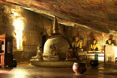 The city of Dambulla is built around a large granite boulder that encloses an important cave complex, Raja Maha Vihara, dating back to the first century. It is the largest and best preserved complex of Sri Lankan caves. The site consists of about eighty caves, five shrines, four main monasteries. It contains 157 statues, 153 images of the Buddha, 3 royal images and 4 images of deities. The mural paintings, covering 2,100 square meters, represent, among others, the temptation of Buddha by the demon Māra and his first sermon.